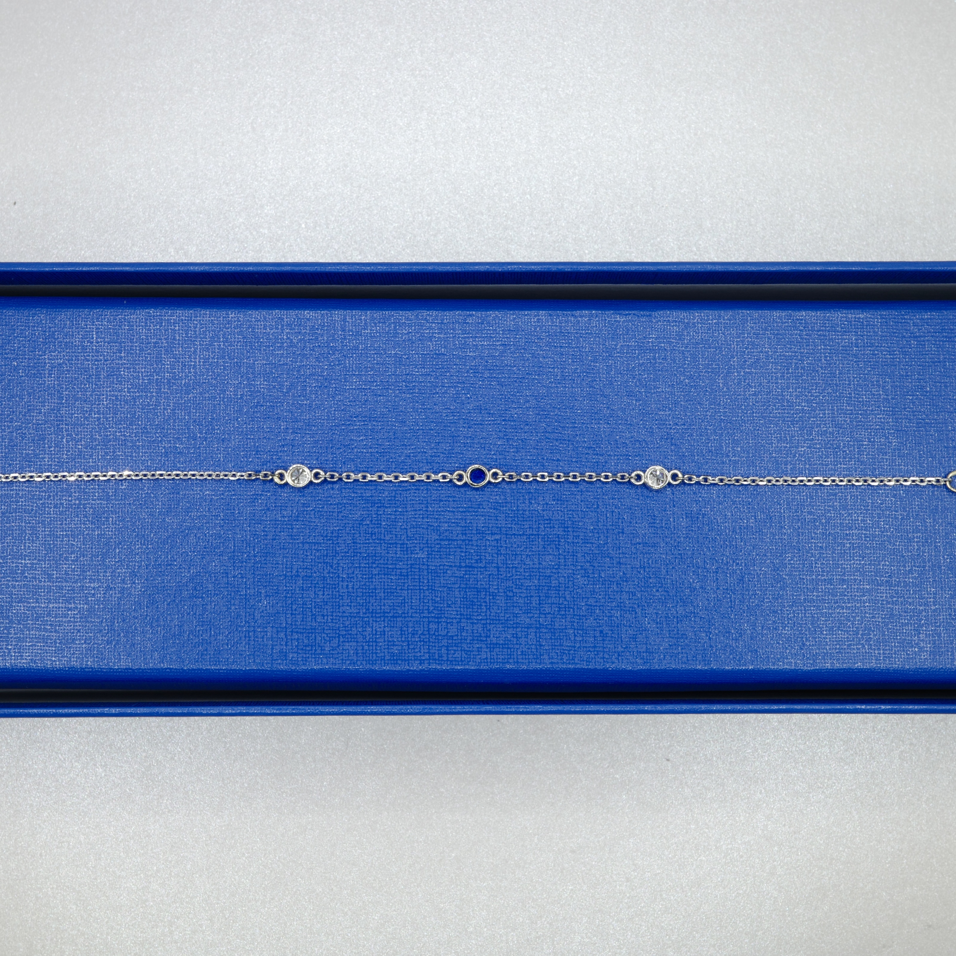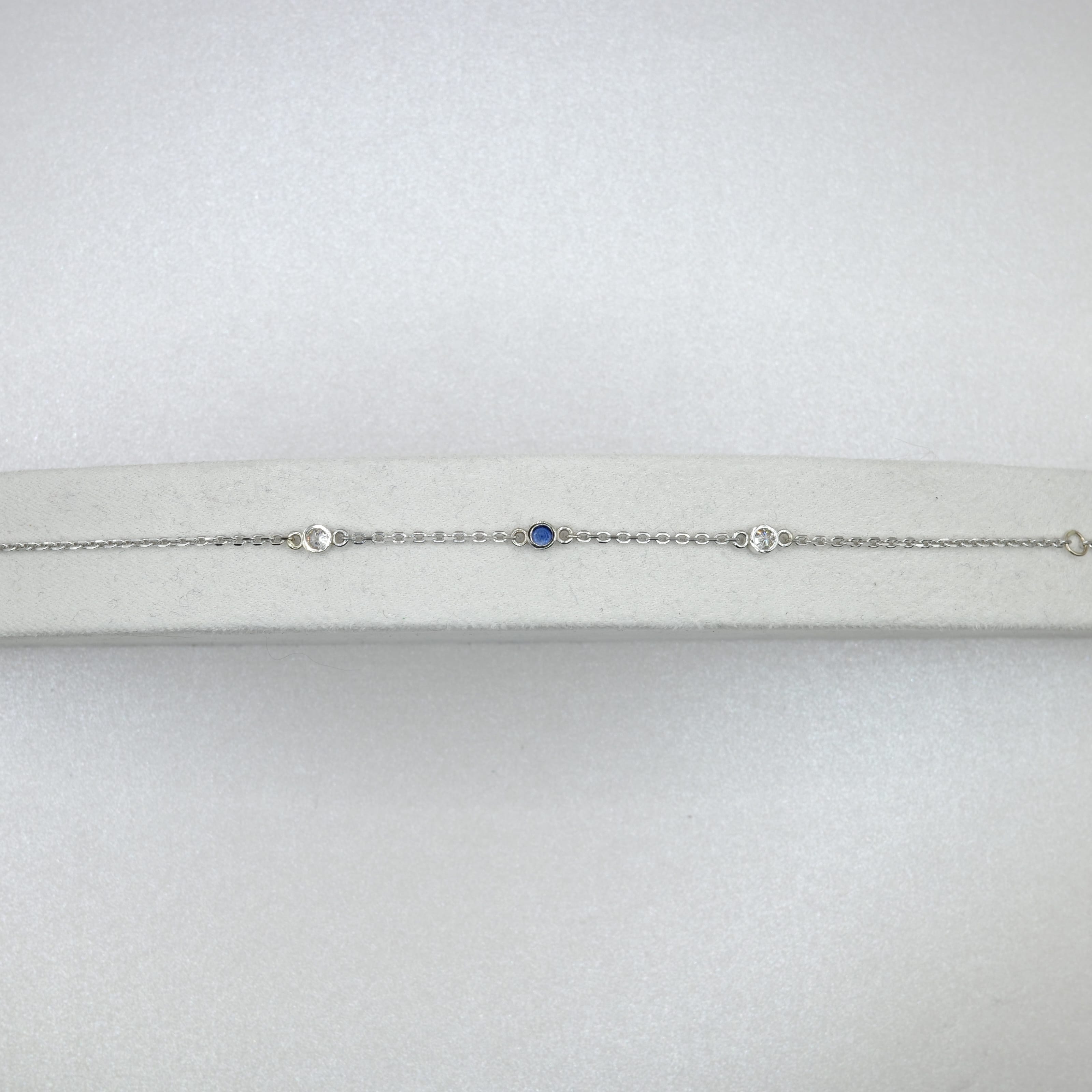 14kt white gold bracelet with diamond rounds (2) and a single sapphire