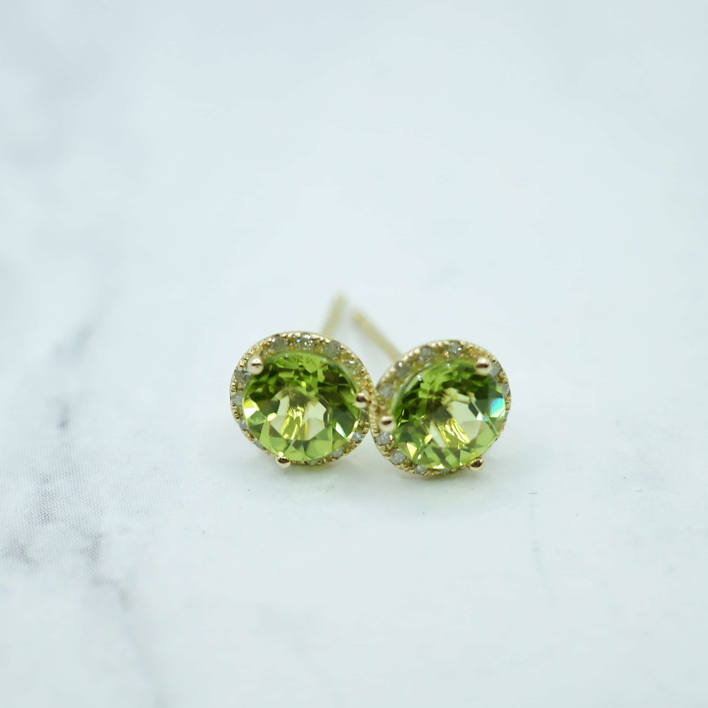 14kt yellow gold peridot (2.05 ctw) stud earrings with diamond rounds in setting.