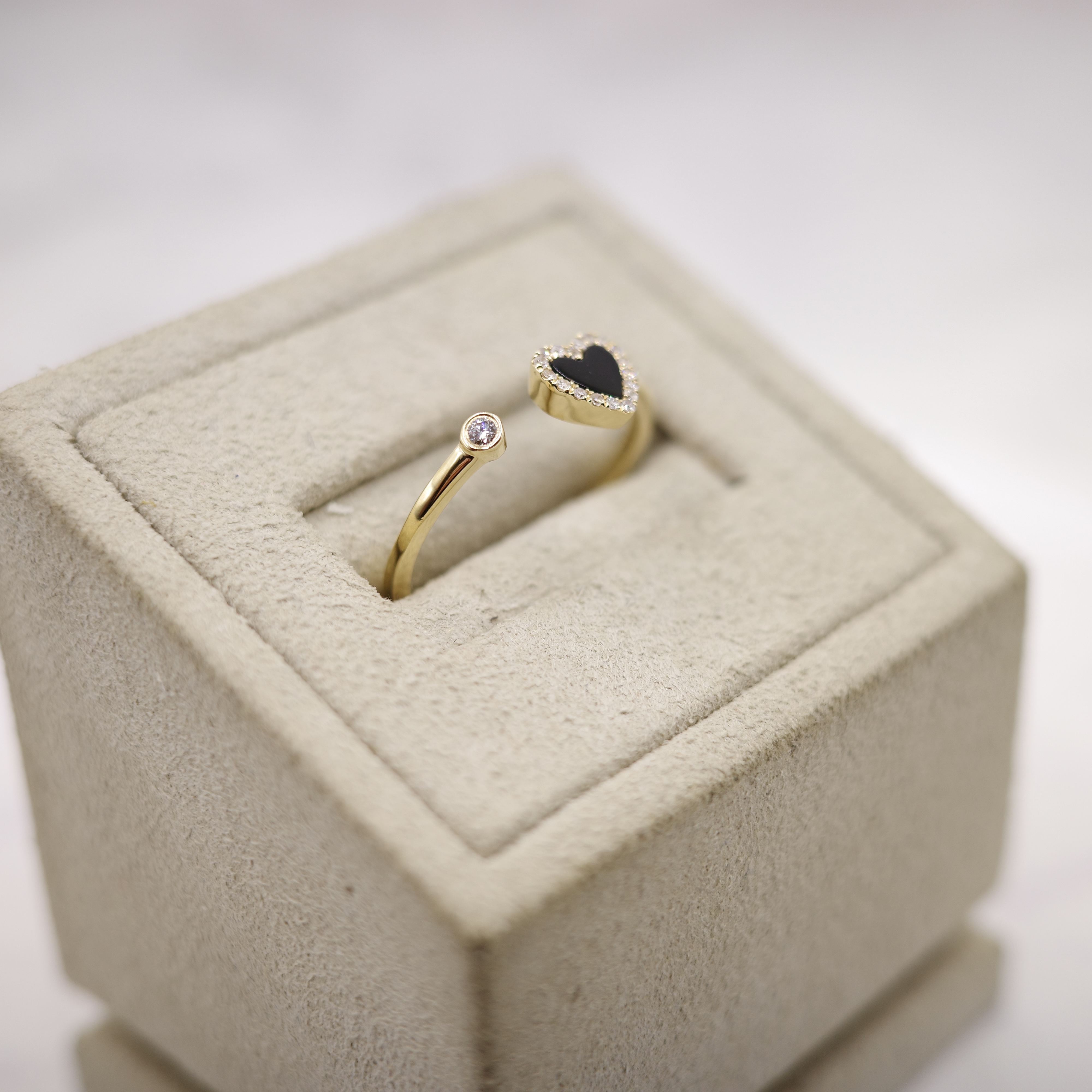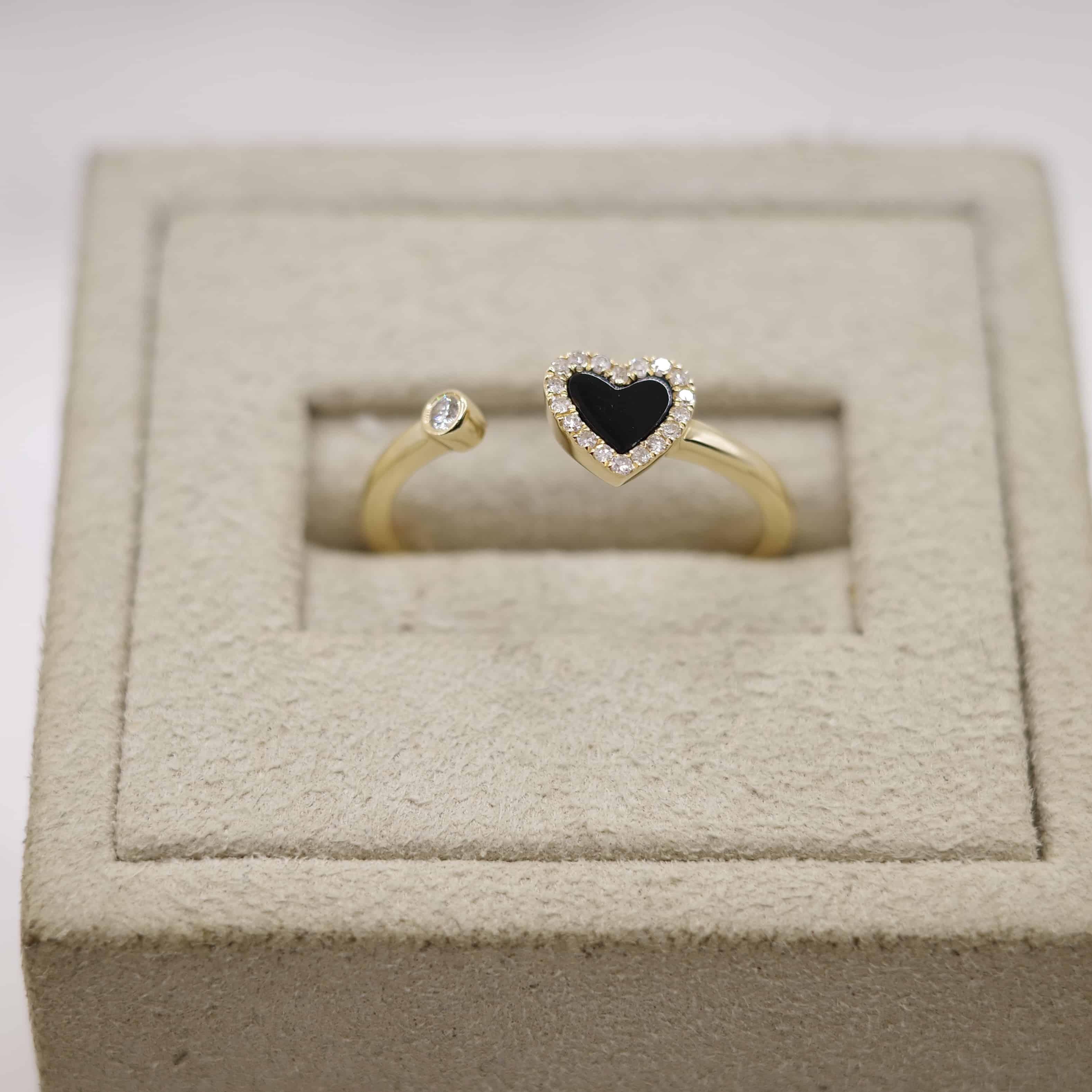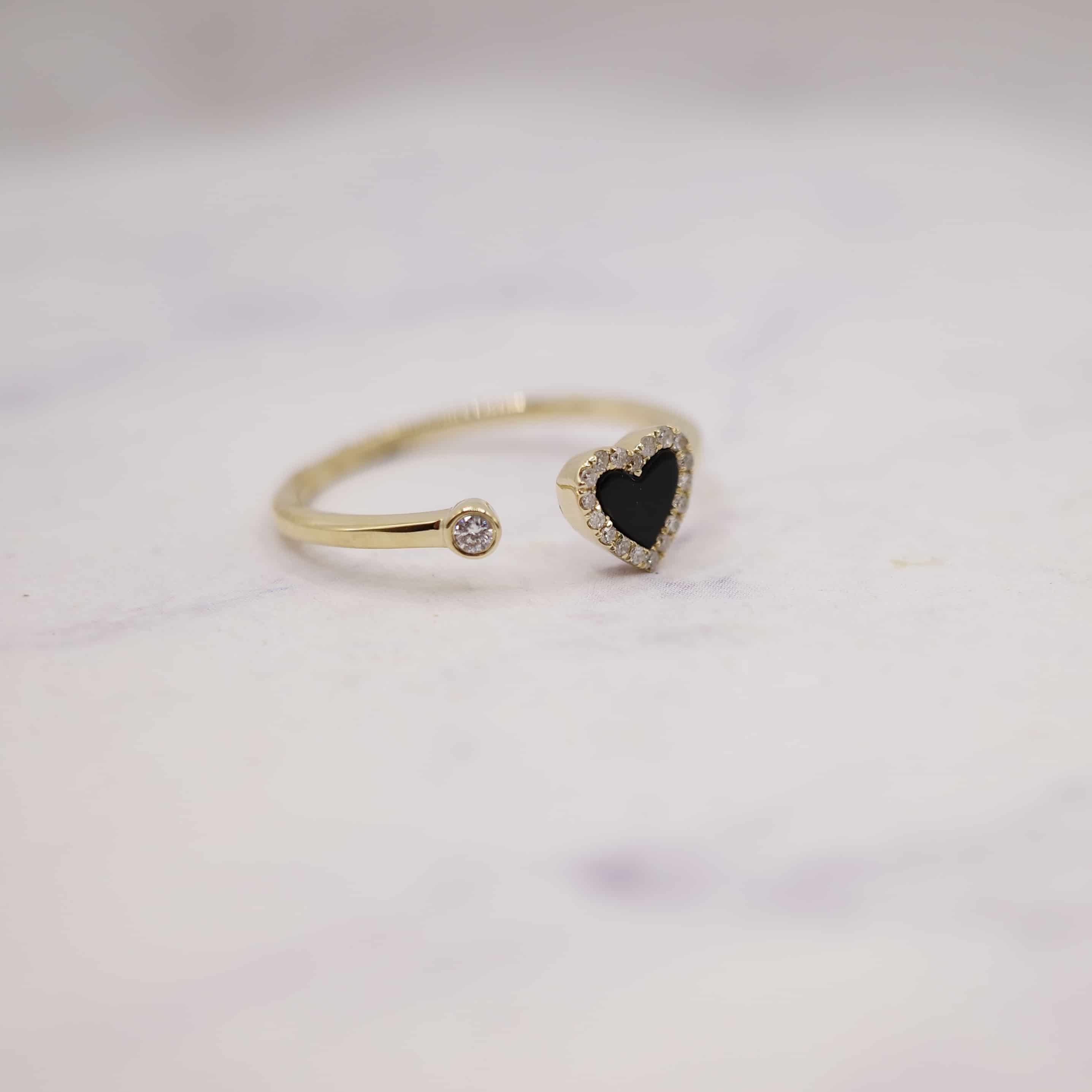 Heart-shaped black onyx ring in 14kt yellow gold band with diamond rounds (0.08 ctw). Please see below for additional information.