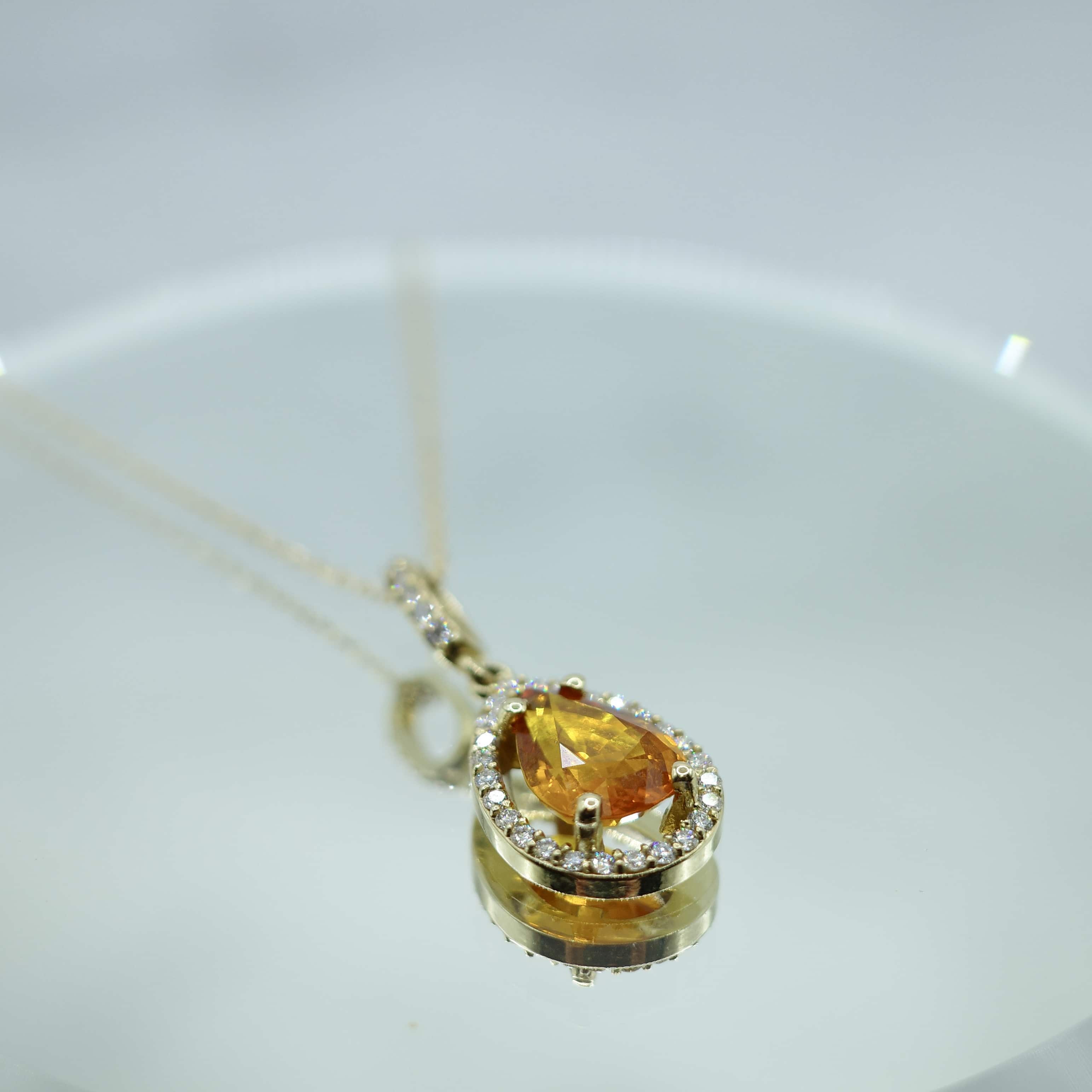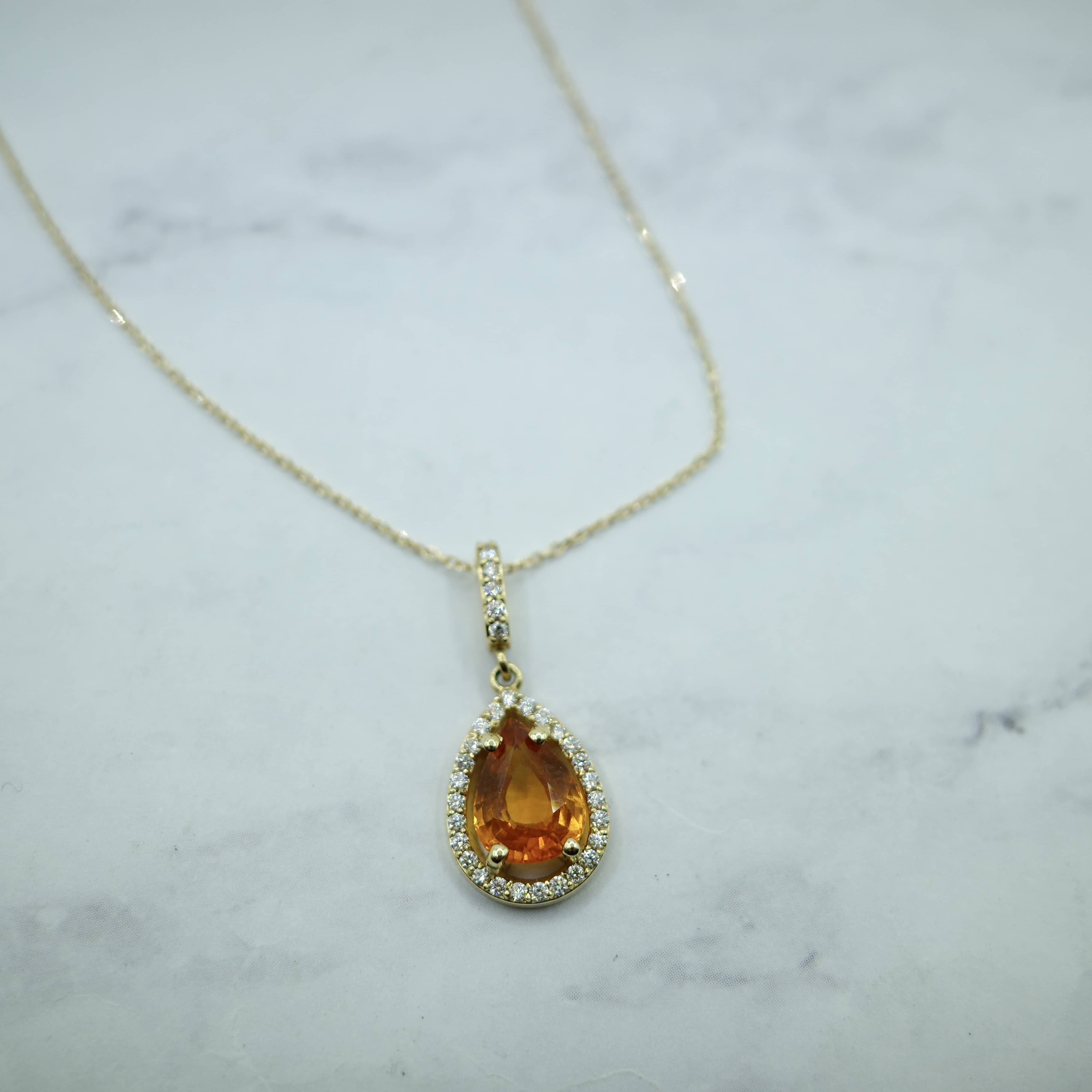 3.23 ctw orange sapphire pendant in 14kt yellow gold setting with diamond inlay (0.31 ctw) on a 14kt yellow gold chain.