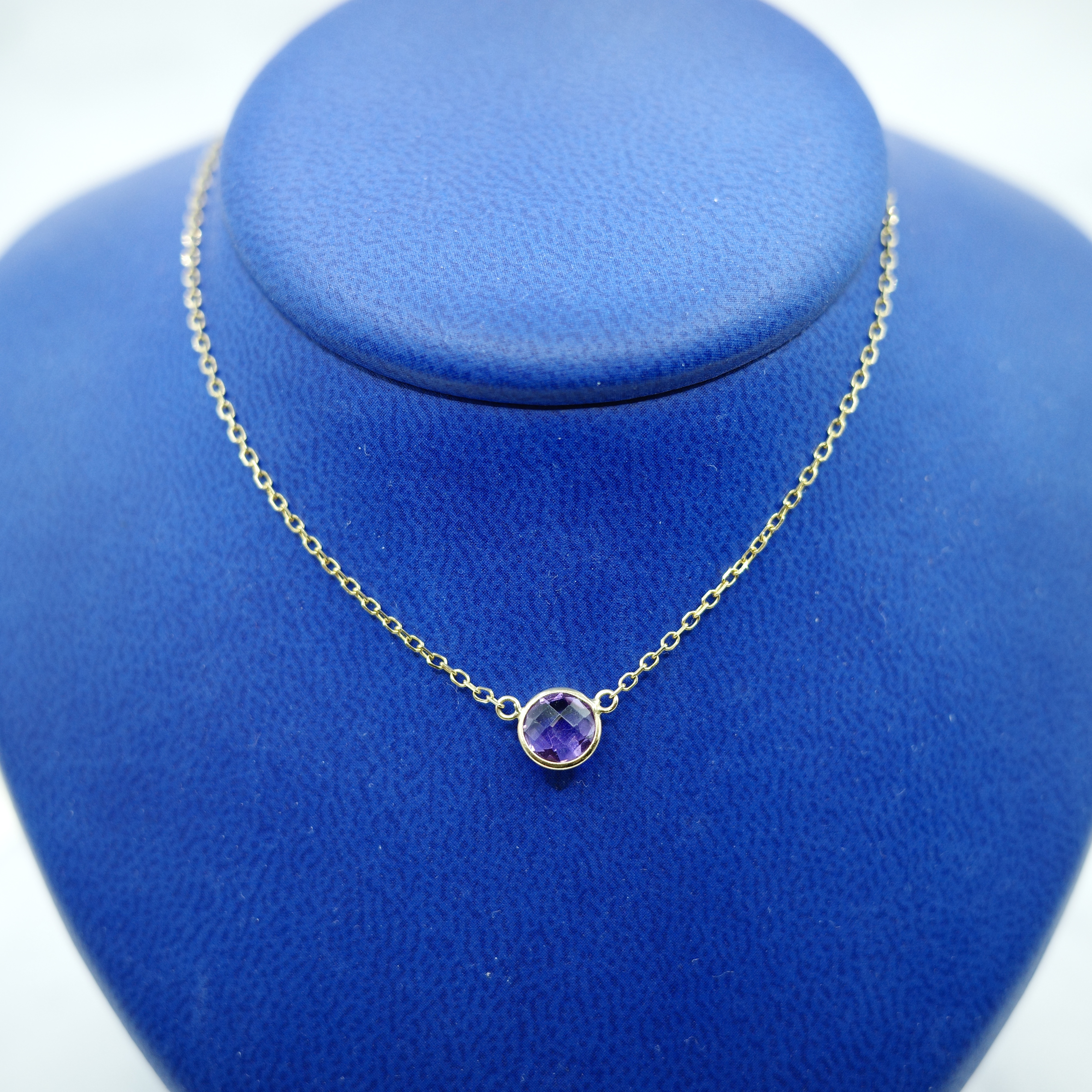 This fashionable necklace features a 0.9 ctw amethyst in a yellow gold setting on a 17′ 14 kt yellow gold chain.