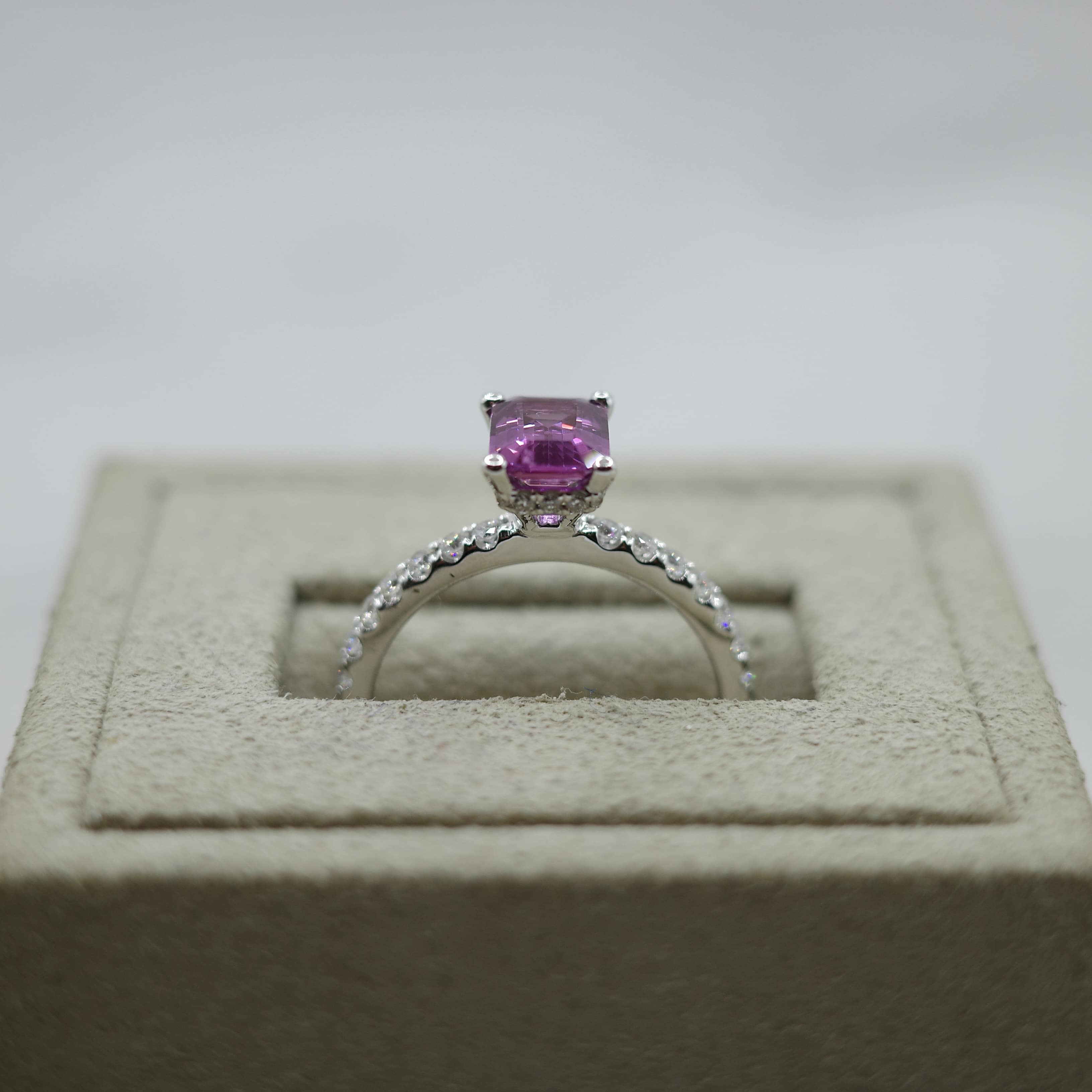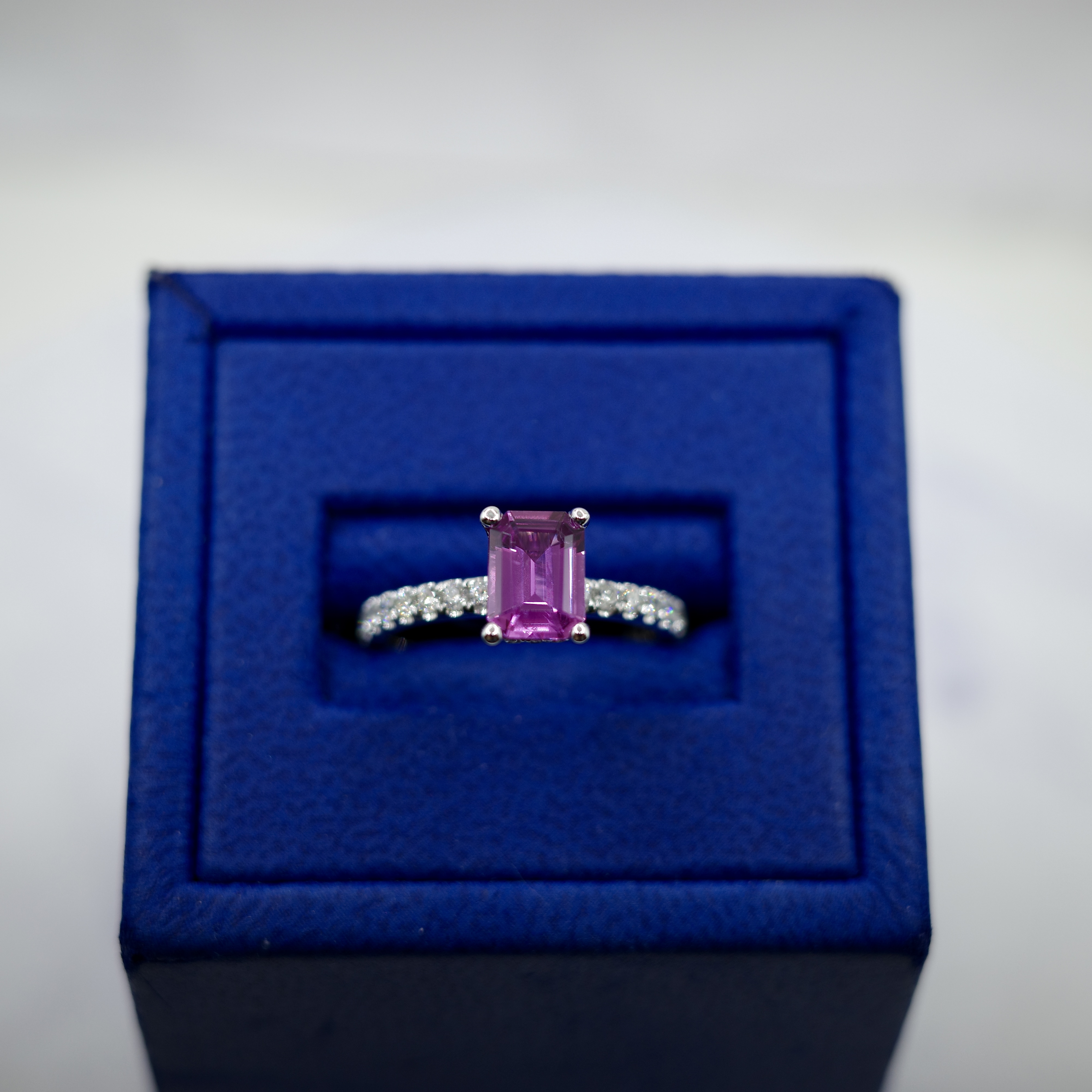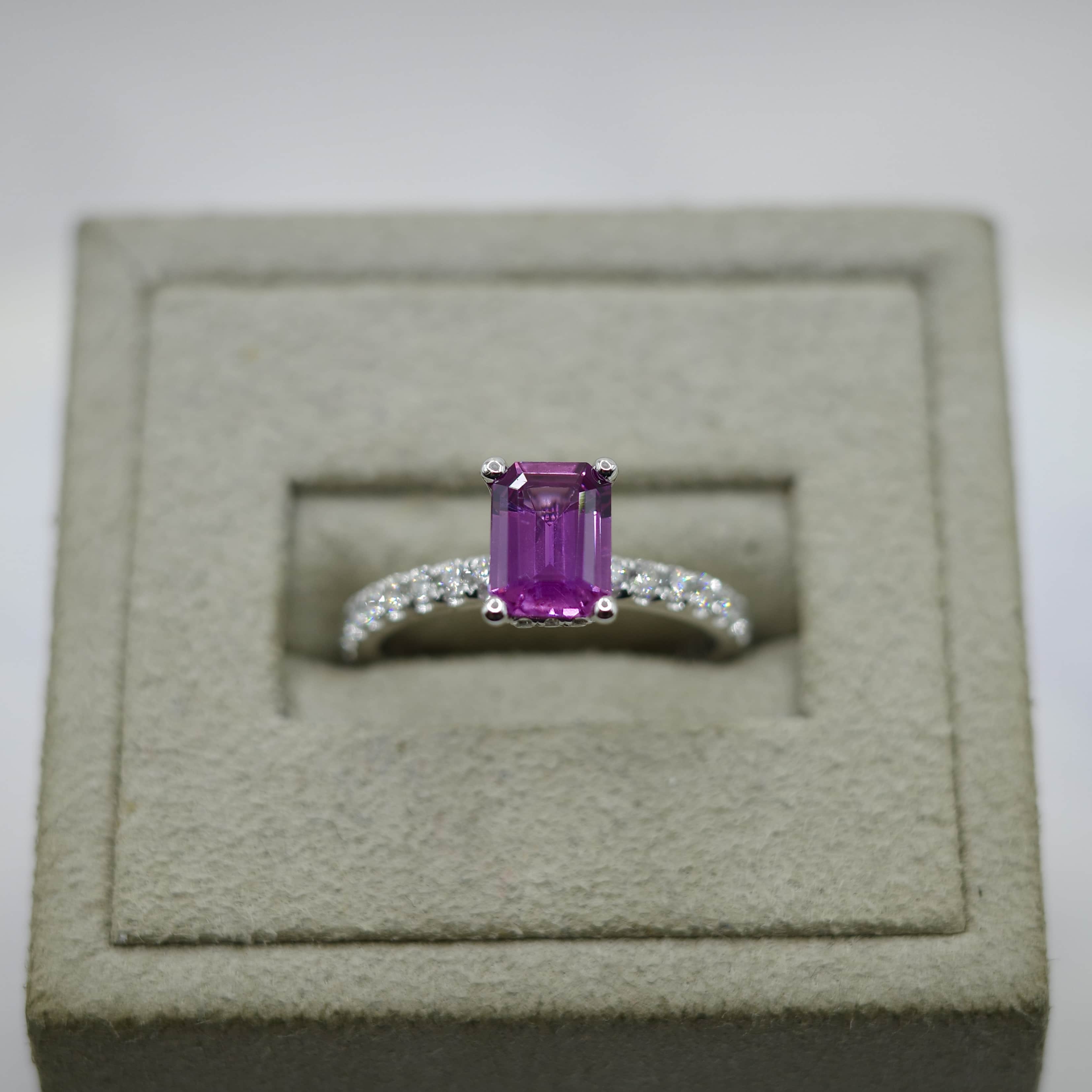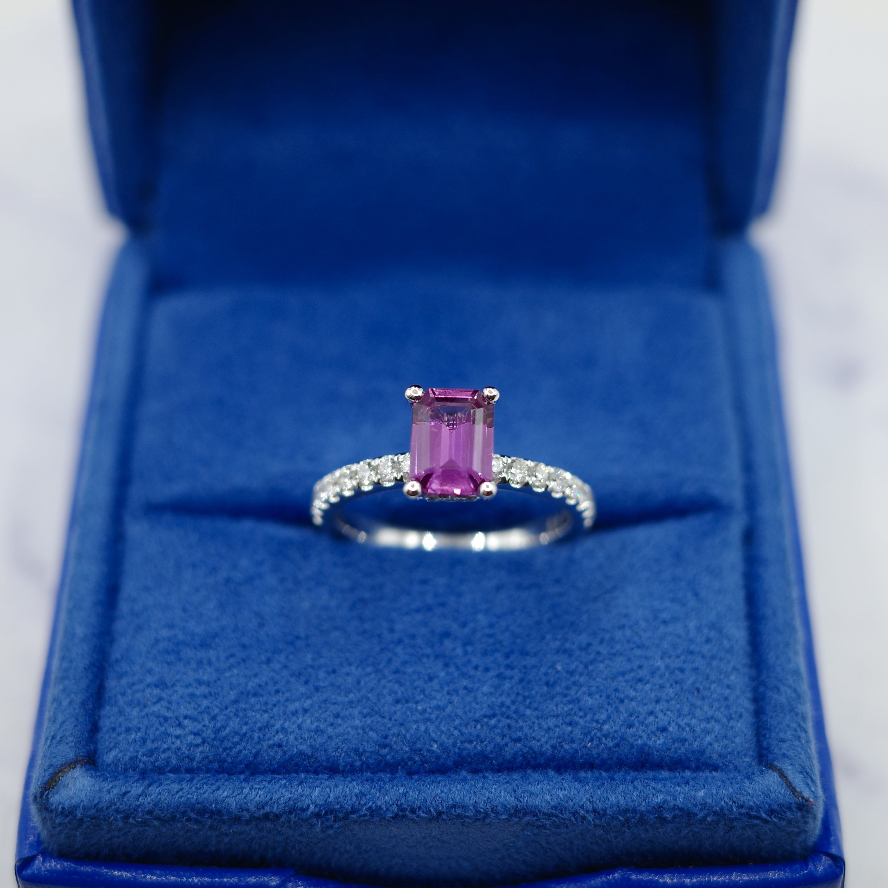 This emerald-cut purple sapphire (1.22 ctw) is set in a 14 kt white gold band with diamond rounds (0.36 ctw).
