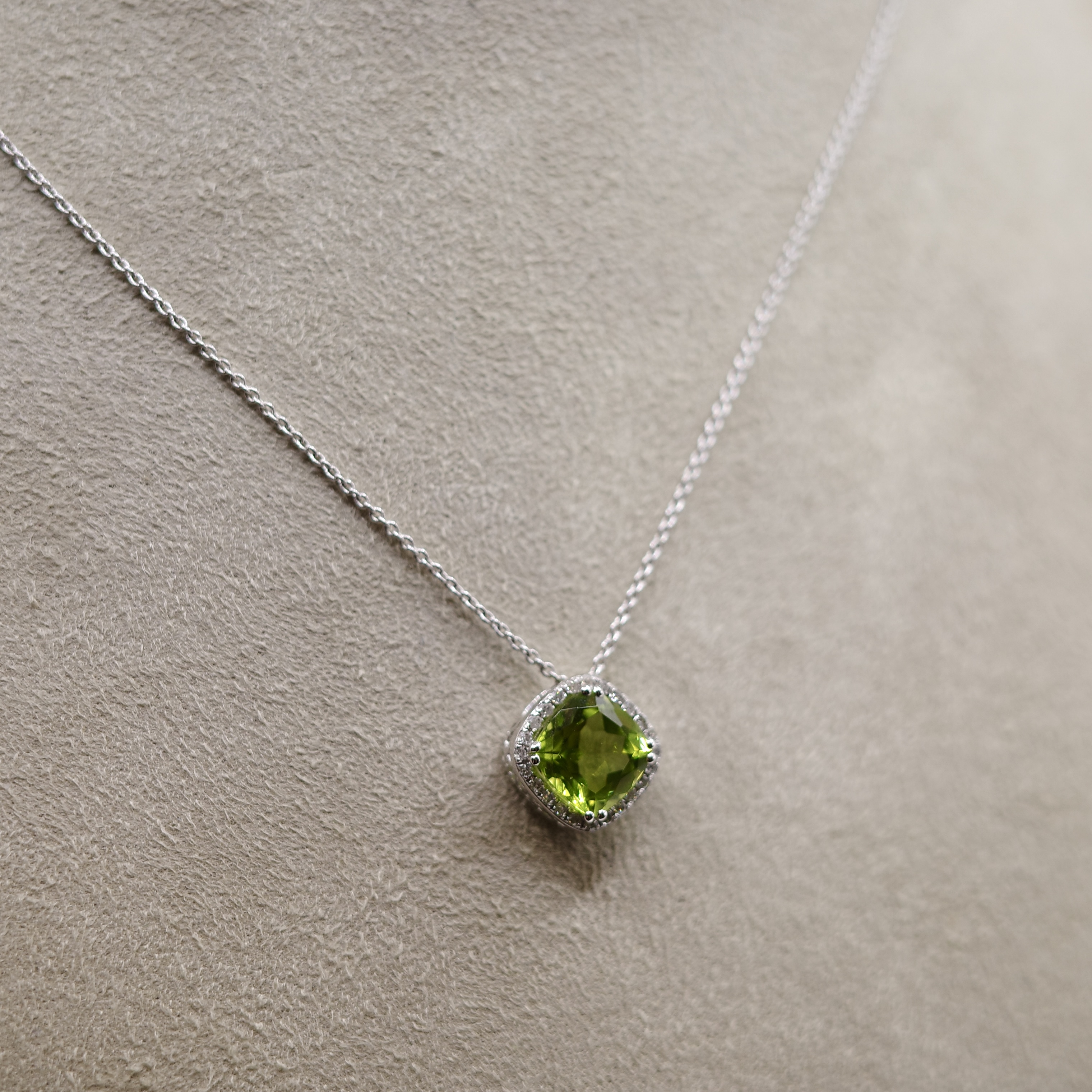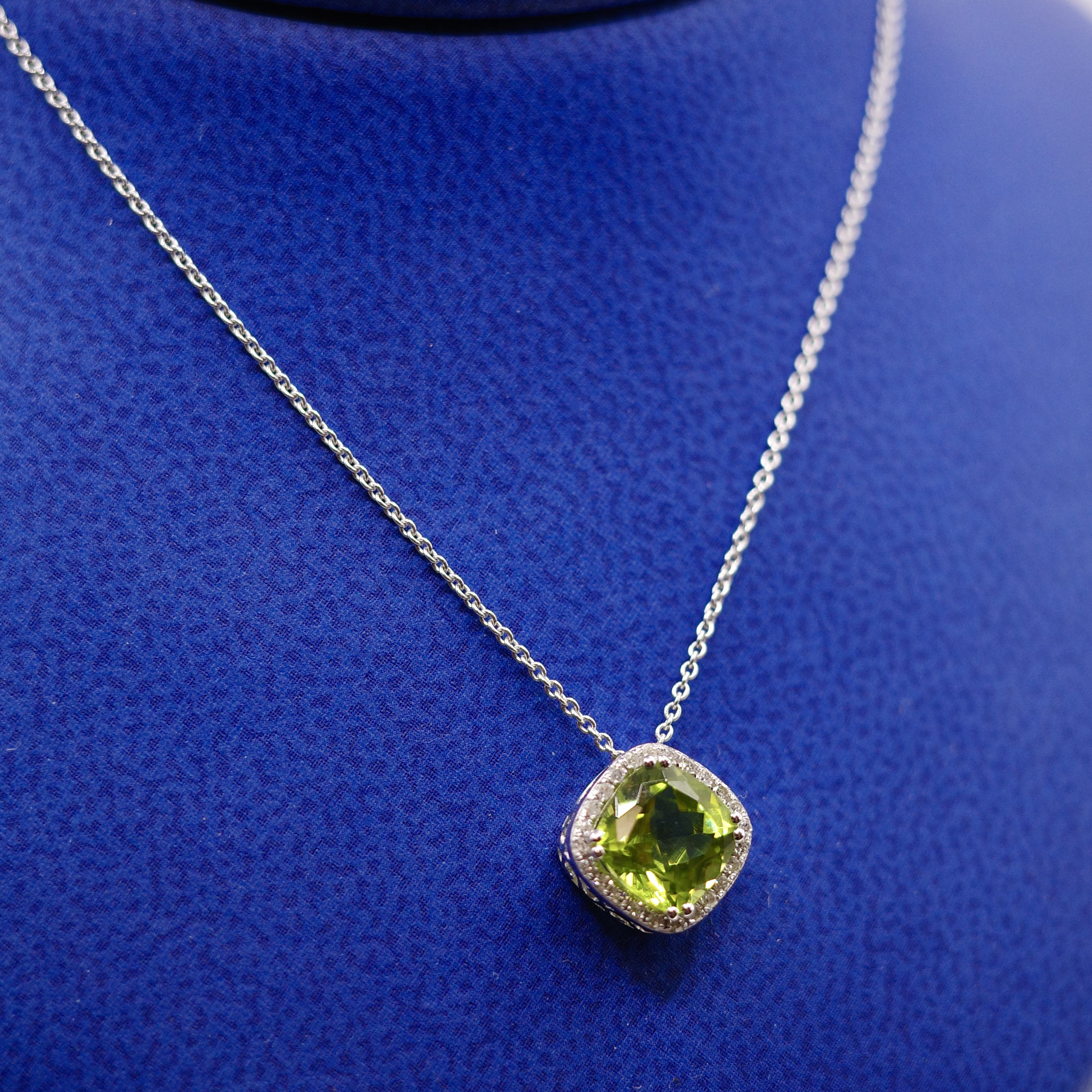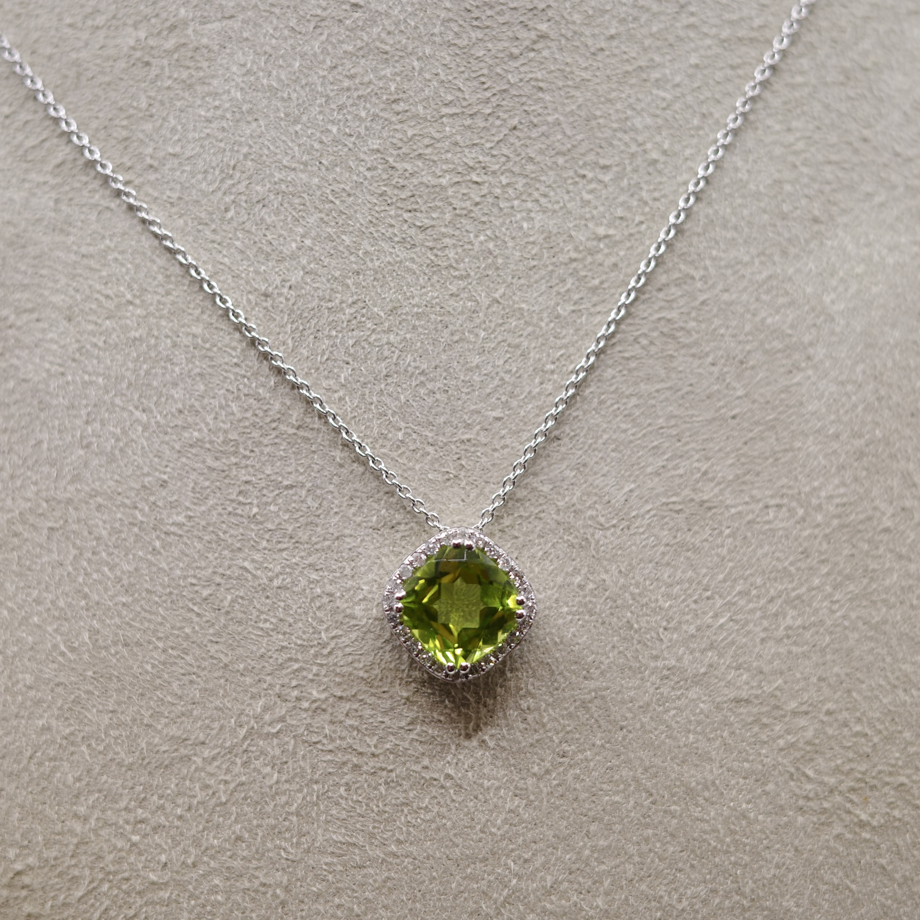 Peridot (1.62 ctw) pendant with diamond rounds (0.07 ctw) set in 14kt white gold.
